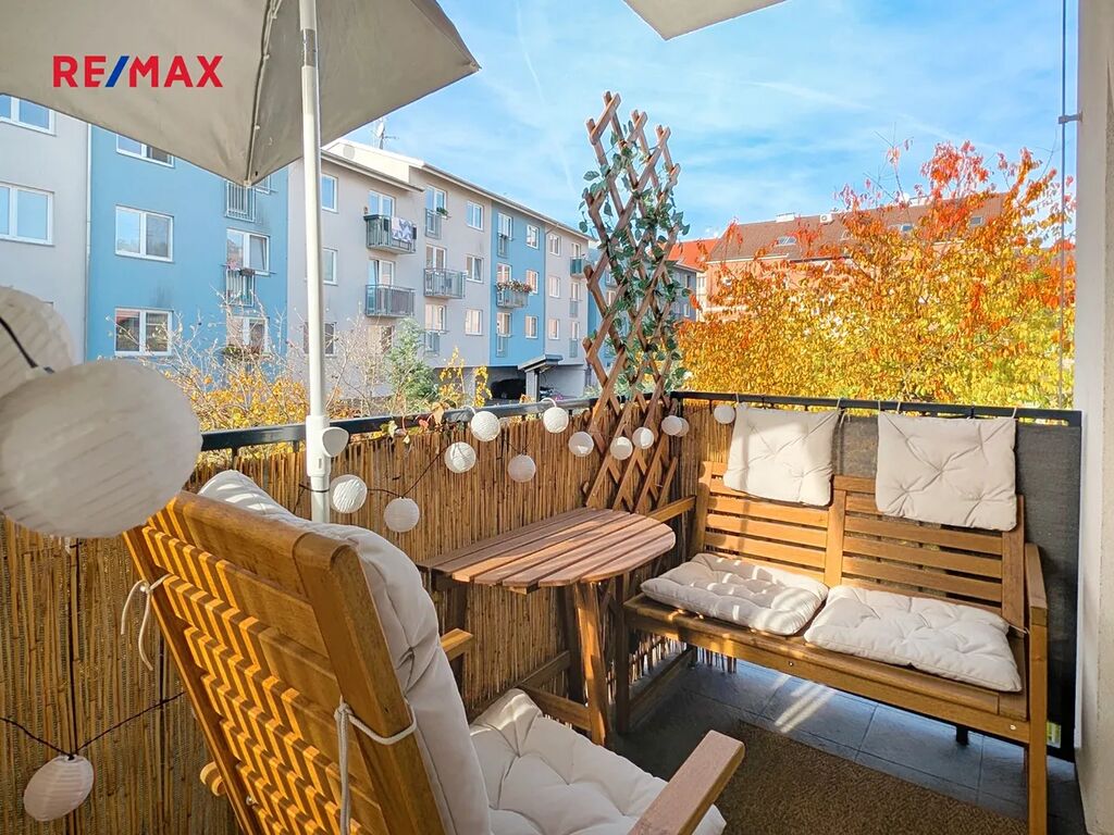 Dispozice bytu je velmi praktická – obývací pokoj s kuchyňským koutem (23,3 m²) je orientován na západ a navazuje na prostorný balkon s výhledem do klidného vnitrobloku. Ze stejné strany je přístupná i ložnice (10,3 m²), která nabízí vstup na balkon. Druhá ložnice (12,9 m²) je situována na východ. Velká francouzská okna o výšce 2 metry propouštějí dostatek denního světla a dodávají interiéru příjemně vzdušný dojem.