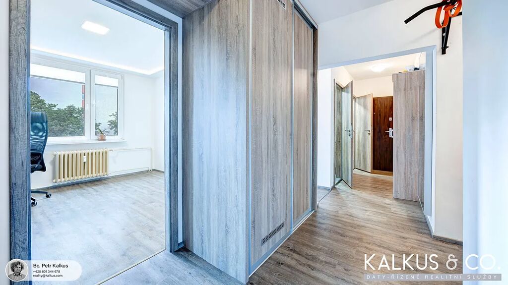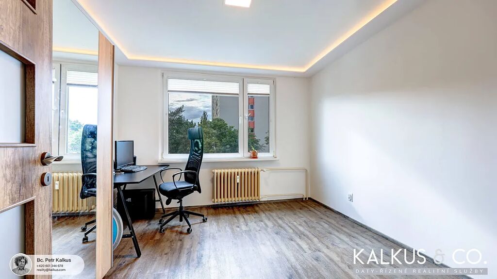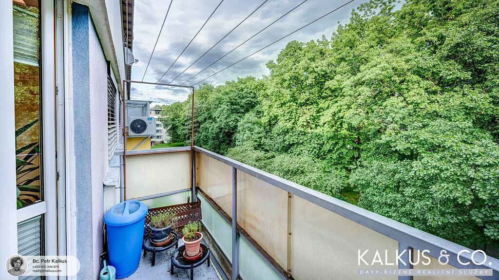 Byt se nachází v příjemném prostředí s výhledem do korun stromů z ložnice, obývacího pokoje i lodžie. Zastávka MHD a prodejna potravin jsou vzdáleny cca 2 minuty chůze, do centra města dojdete pohodlně za 15 minut.