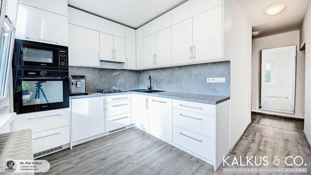 Kuchyně: cca 9,50 m², moderní, plně vybavená vestavnými spotřebiči