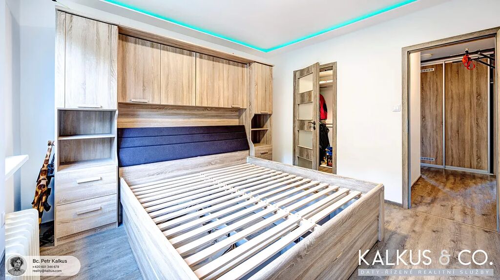 V chodbě se nachází vestavné skříně a příprava pro pračku se sušičkou (přivedená voda i odpady). Byt je vybaven nápaditým LED podsvícením v podhledech s RGB pásky. Vytápění zajišťují Opatovice, vaření je na plynovém sporáku, okna jsou osazena žaluziemi.
