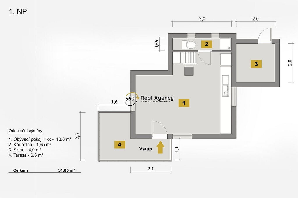 V přízemí se nachází obývací pokoj s kuchyňským koutem a koupelna s toaletou.