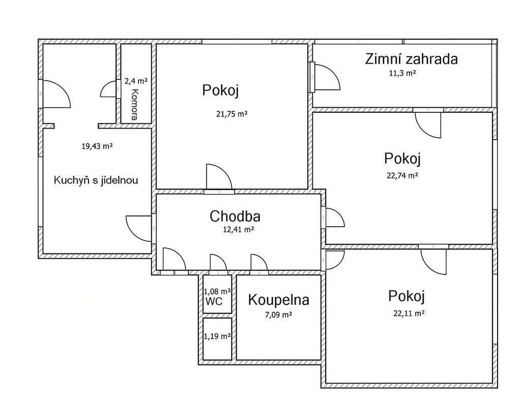 Celková výměra bytu je 121,5 m² a dispozice jsou následující: