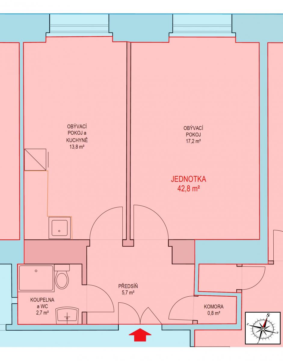Byt je po částečné cca 5 let staré rekonstrukci zahrnující zejména renovaci koupelny, z velké části elektrorozvodů, pokládku podlahových krytin a umístění economy kuchyňské linky. Praktická dispozice bytu zahrnuje předsíň se vstupem do všech ostatních místností bytu, pokoj s kuchyňským koutem, ložnici, koupelnu společnou s WC a malou komoru.