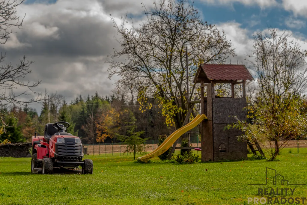 Před domem pohodlně zaparkujete dvě auta a k dispozici je i garáž s dálkově ovládanými vraty. Z obývacího pokoje je krásný výhled do udržované zahrady. Je zde prostor pro grilování, posezení s rodinou i přáteli, stodola na uskladnění dřeva a další stavba s krásnými vraty a kováním, vhodná na zahradní techniku.