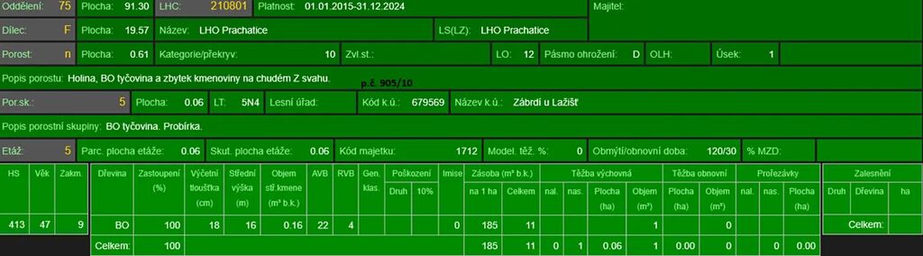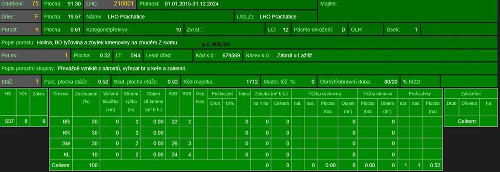 - p.č. 905/10 vedená jako lesní pozemek o celkové výměře 6 100 m2 (stáří lesa 57 let- zastoupení dřevin borovice, stáří lesa 18 let - zastoupení dřevin bříza, keře, smrk, javor), pozemek je ve svahu,