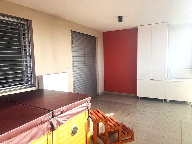 Vzhledem k tomu, že se byt nachází v nejvyšším patře, bylo možné na terasu nainstalovat gril a do obývacího pokoje krbová kamna. Terasu lze nechat uzavřenou nebo zcela otevřít. Rovněž je možné ji celou zastínit proti slunci. Součástí terasy je venkovní gril s posezením, vestavěné skříně na míru a vířivka. Je možné zde umístit i saunu.