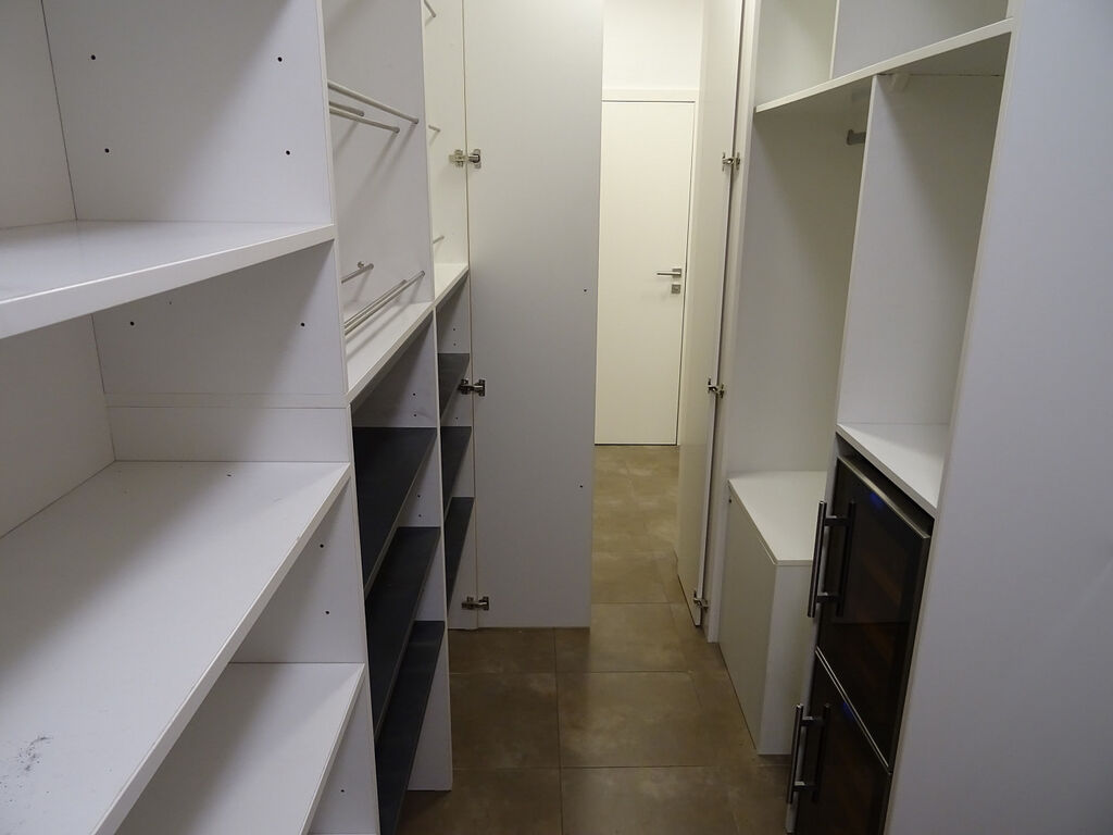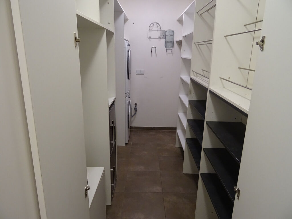 Další výhodou bytu je prostorná šatna, jejíž součástí je nejen pračka se sušičkou, ale i vinotéka.