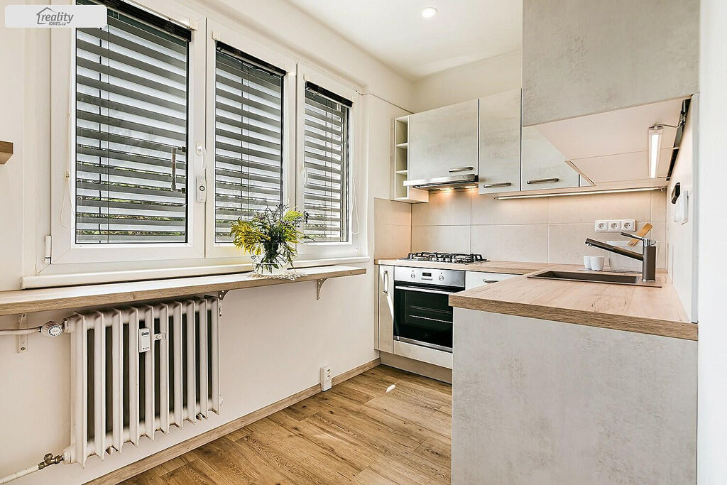 Vybavení : kuchyňská linka včetně spotřebičů ( plynová varná deska, elektrická trouba, digestoř), odkládací stěna, nové dveře a zárubně, venkovní žaluzie.