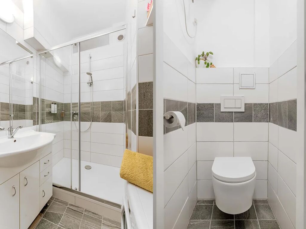 prostorným sprchovým koutem a protihlukovými bezpečnostními dveřmi. Dostatek