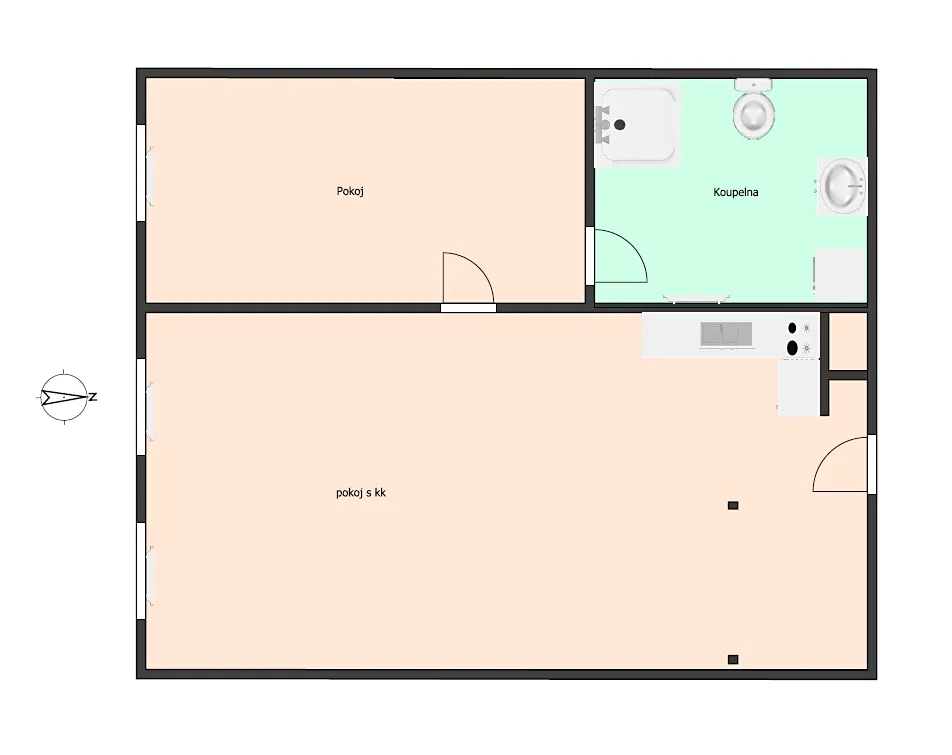Skládá se z obývacího pokoje s kuchyňským koutem nad kterým je vestavěné menší patro a dále z menšího pokoje a koupelny.