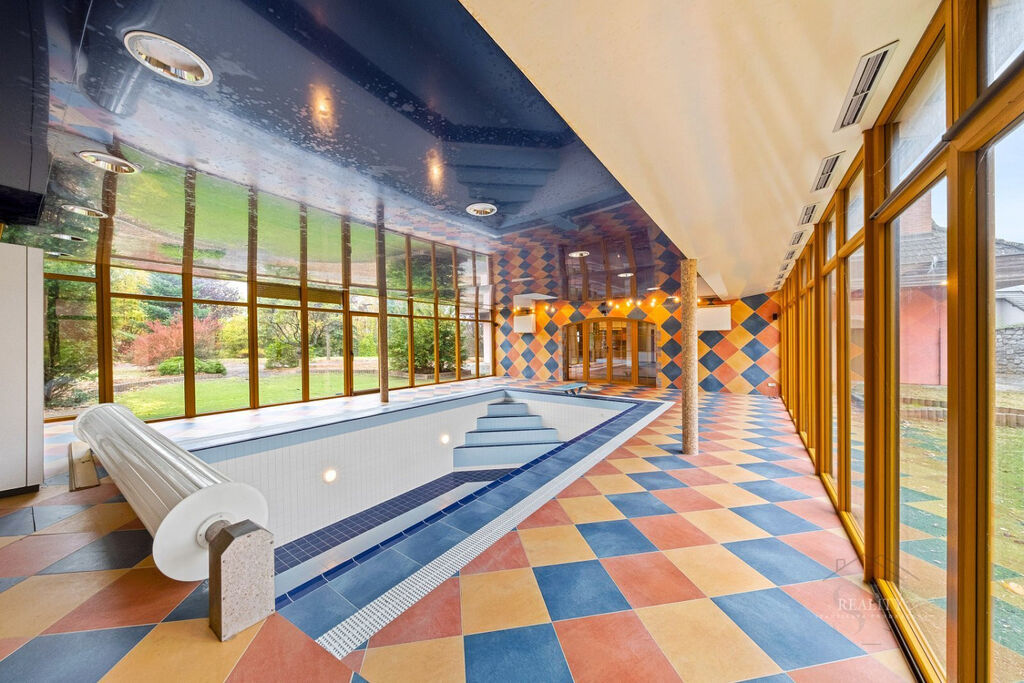 samostatná wellness hala 108 m² (krytý bazén s protiproudem 7,5x 3,5m², hl. 1,7 m, sauna, relaxační zóna)