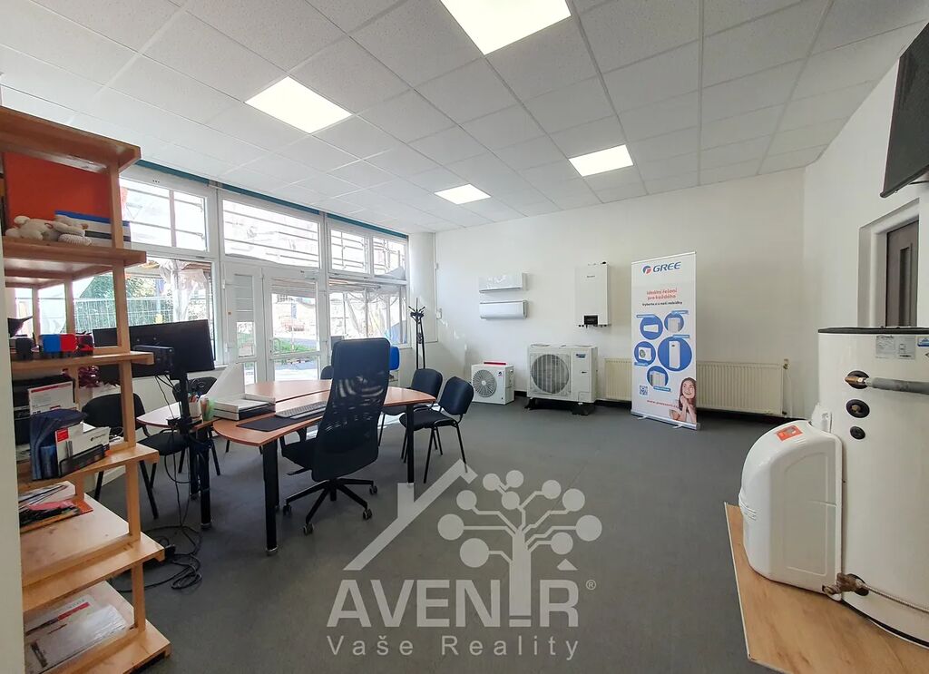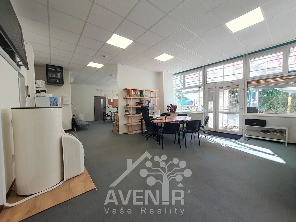 Dispoziční uspořádání: velká vstupní kancelář s kuchyňkou, malá kancelář, 2x sklad malý, sklad velký se zadním vstupem, toaleta, sprchový kout. Velké výlohy umožňují umístění reklamních poutačů.