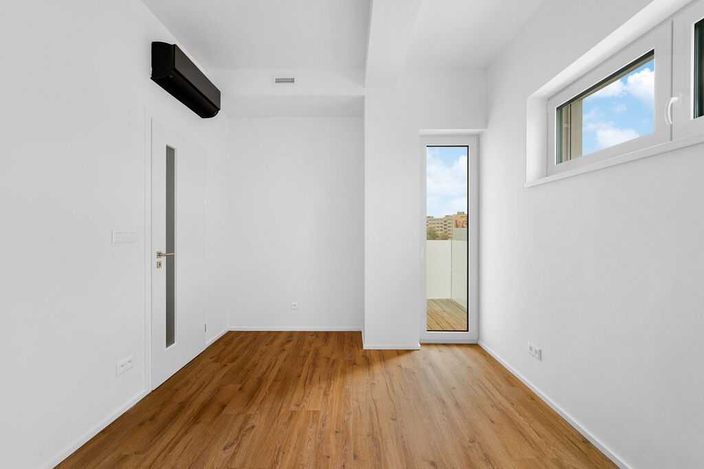 Byt o dispozici 2+kk zaujme nadstandardní velikostí 56m², velkými prosklenými okny s trojskly a rovnou dvěma balkony - jeden poskytuje příjemný prostor pro relaxaci a druhý třeba pro pěstování bylinek. Interiér jsme vybavili kvalitní kuchyní na míru se všemi spotřebiči a dalším užitečným nábytkem dle fotografií. V koupelně pak najdete praktickou pračku se sušičkou. V dnešní době jistě oceníte i přítomnost klimatizace a elektricky ovládaných venkovních žaluzií. V zimě se naopak příjemně zahřejete podlahovým topením.