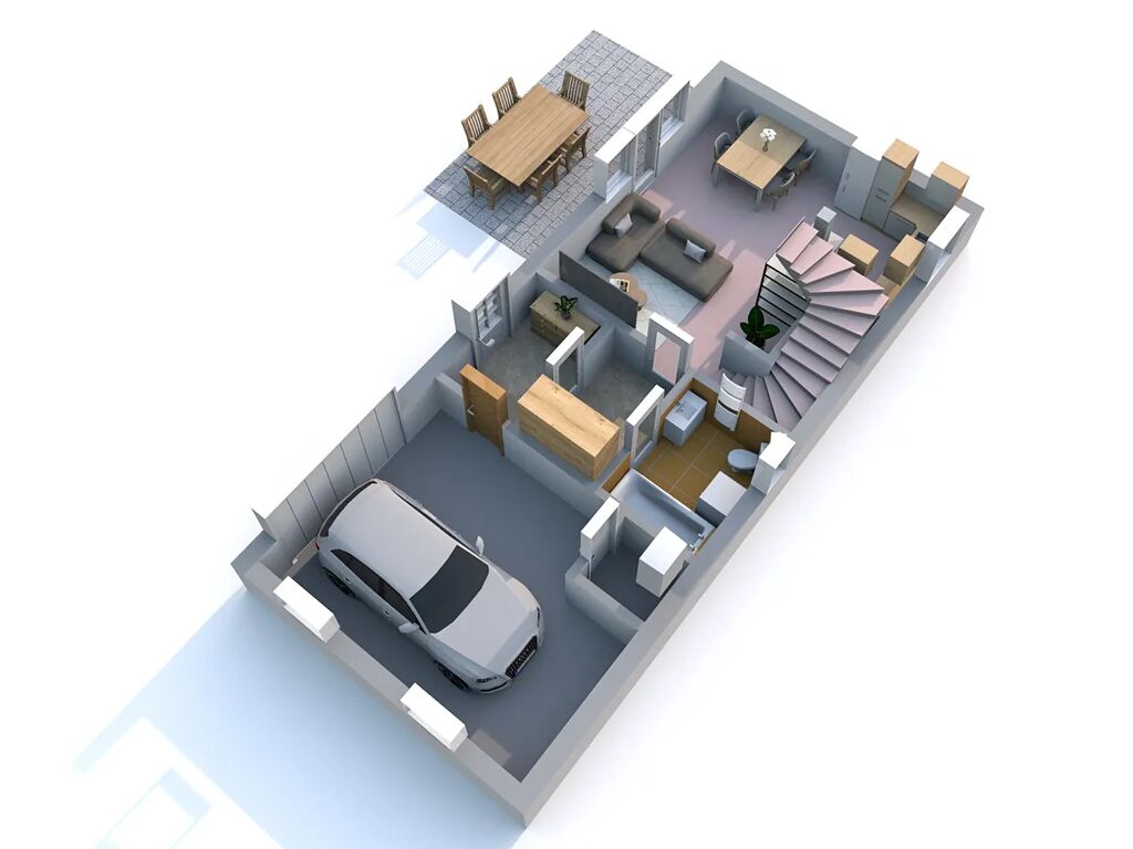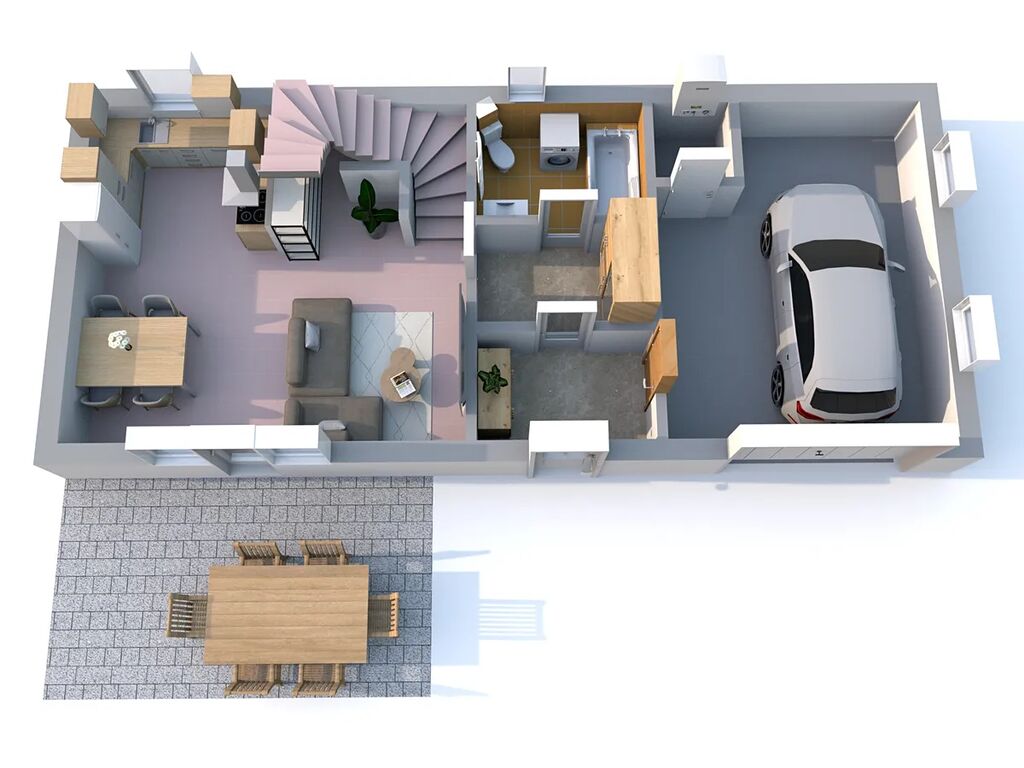 • v přízemí se nachází prostorný obývací pokoj s kuchyňským koutem, který tvoří srdce celého domu. Z obývací části je přímý vstup na zastřešenou terasu o velikosti 15 m², ideální pro letní grilování, rodinné obědy nebo večerní posezení.