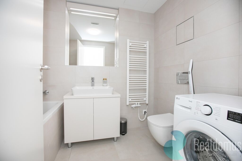 Nabízíme k pronájmu byt 2+kk o rozloze 57 m², který se nachází v novostavbě. Byt leží v 6. patře z celkem 12 pater s výtahem. Má prostornou terasu 20 m2 s pěkným výhledem. Nemovitost je částečně vybavená. Koupelna s vanou i pračkou. V předsíni vestavěné skříně. V ložnici je manželská postel a vestavné skříně. Kuchyňská linka, lednice, sedačka a televize.