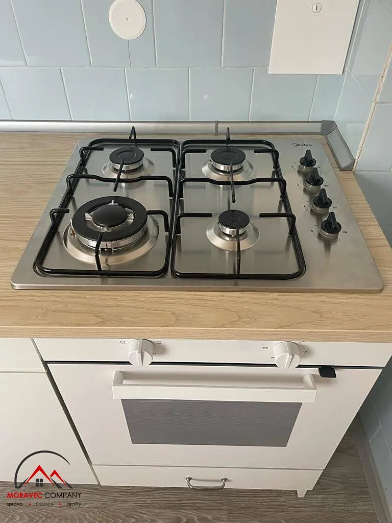 V bytě je kuchyně s kombinovaným sporákem, dále samostatný pokoj a koupelna s vanou, praktickými úložnými skříňkami a WC. Vytápění zajišťují plynové gamaty, ohřev vody je řešen elektrickým bojlerem.
