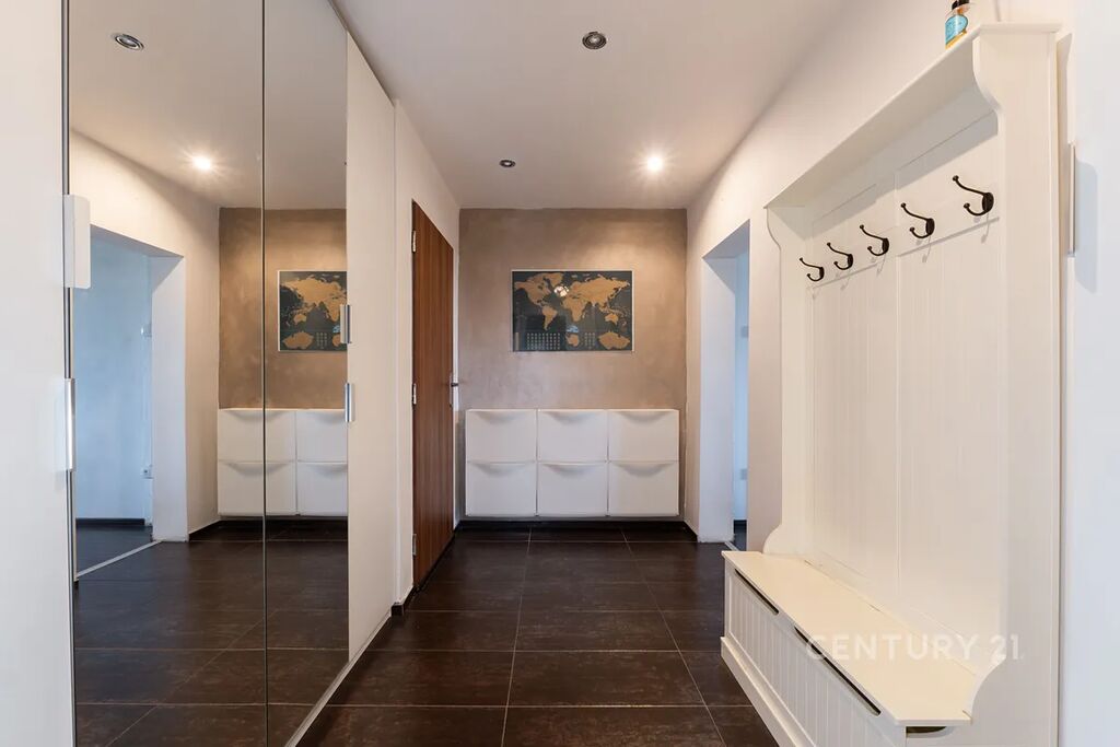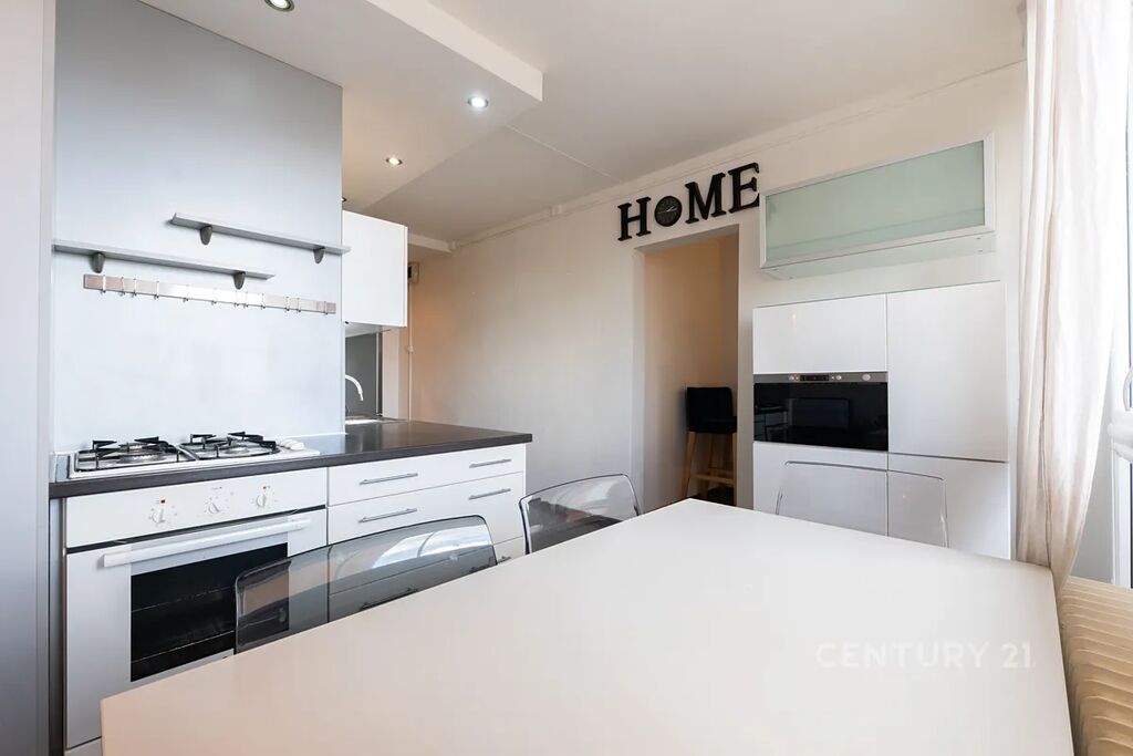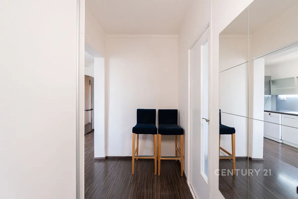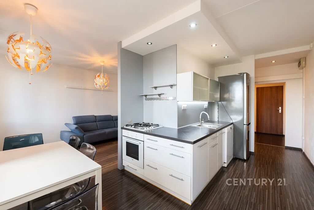 • Moderní kuchyňská linka (LED podsvícení) s vestavnými spotřebiči (myčka a elektrická trouba s plynovou varnou deskou) je propojena s obývacím pokojem a jídelním koutem. Podél celého prostoru vede lodžie, obývací prostor je tak vzdušný a světlý