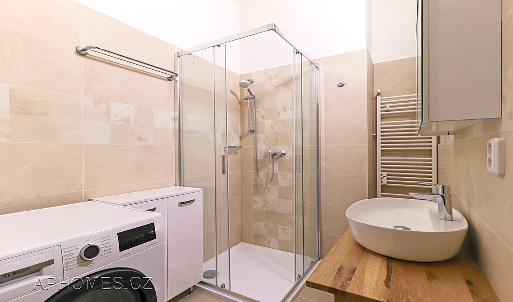 Součástí vybavení bytu je zcela nová moderní kuchyňská linka (vestavěná trouba, digestoř, sklokeramická varná deska, myčka nádobí i lednice.