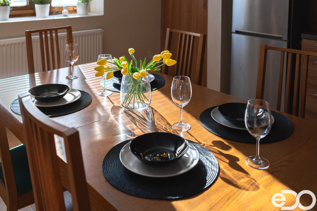Dispozice domu zahrnuje prostorný obývací pokoj se vstupem na balkon, kuchyň s jídelní částí, 4 samostatné ložnice, koupelnu a samostatné WC. Možnost ponechání kompletního vybavení domu.