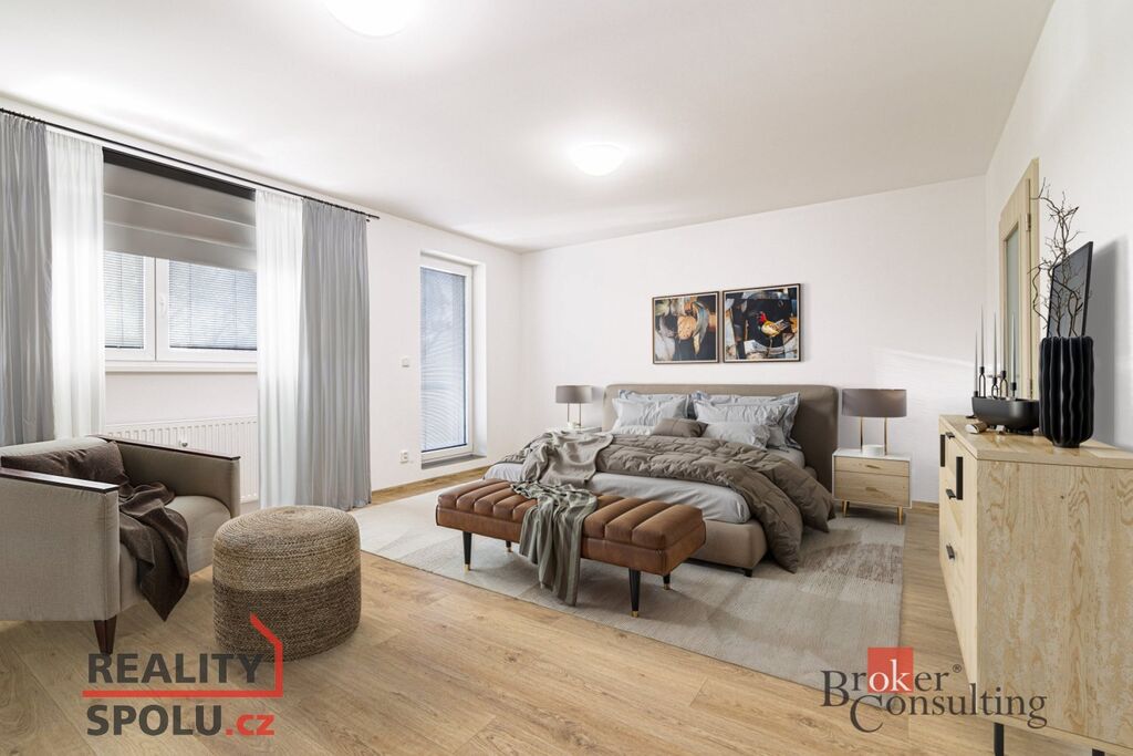 Druhá terasa, menší balkon, je přístupná z hlavní ložnice, která disponuje vlastní koupelnou a samostatnou šatnou – ideální řešení pro každého, kdo si potrpí na soukromí a komfort.