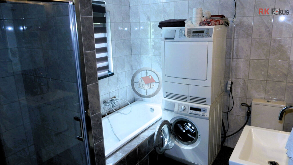 Přízemí: obývací pokoj s kamny, kuchyně, koupelna s WC