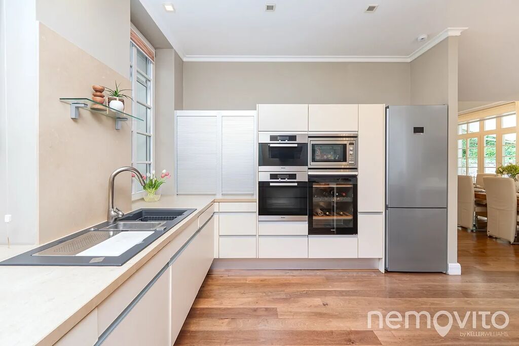 On the first floor there is also a quest room or an office (dressing room, bathroom). The hall is dominated by a beautiful wooden staircase. The master bedroom (24 sqm) with an en-suite bathroom and a free-standing bathtub also has a dressing room. The children's rooms (19 and 25 sqm) are connected by a bathroom and a large dressing room. Above the entire floor plan of the house there is a spacious attic. The current layout offers a 4-bedroom villa with 3 bathrooms.