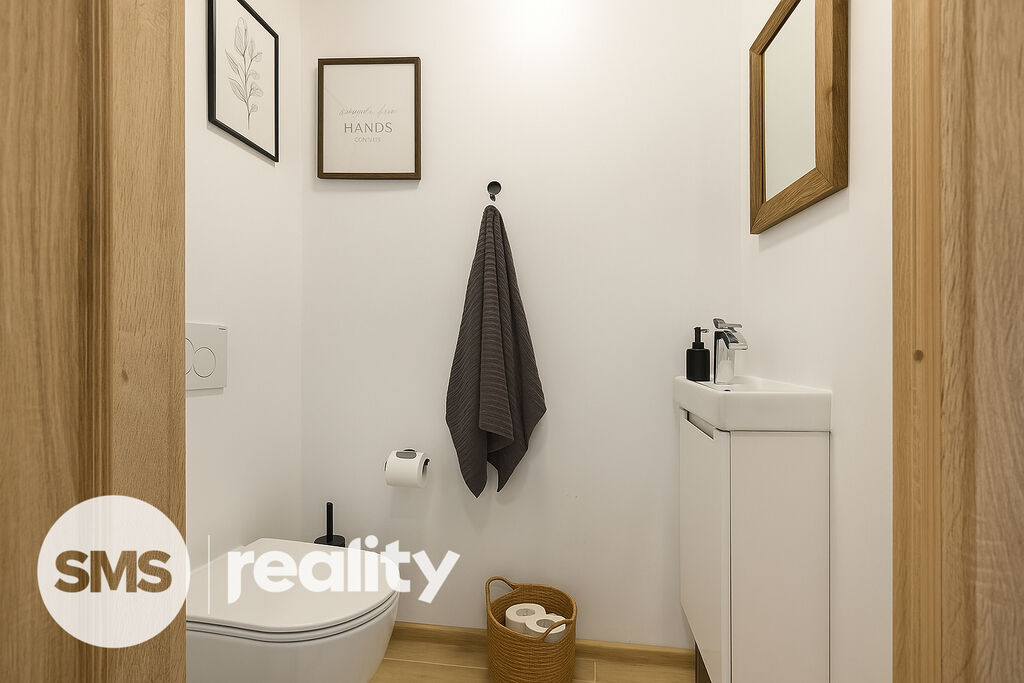 Toaleta pro hosty se nachází naproti verandě, takže návštěvníci nemusí procházet směrem k ložnicové části domu, což zaručuje maximální soukromí a komfort pro všechny obyvatele.