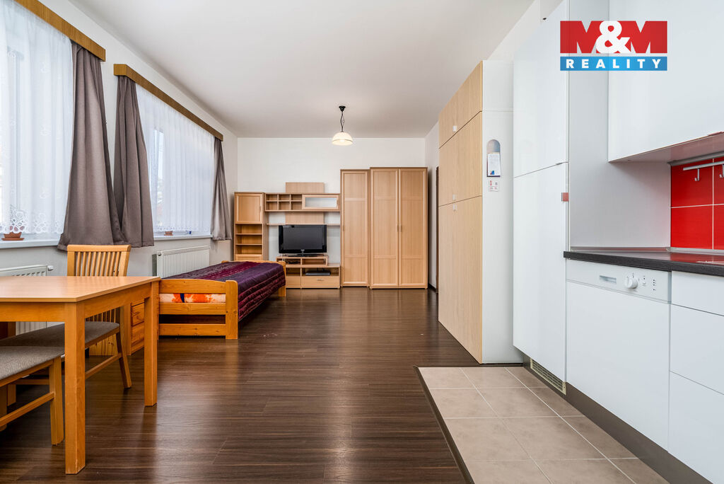 Byt je v hezkém stavu a prodává se včetně části vybavení - kuchyňské linky se spotřebiči (lednice, myčka, el. trouba, varná deska) a skříní. Dispozice bytu zahrnuje vstupní chodbu, koupelnu s podlahovým vytápěním, vanou a toaletou, obývací pokoj s kuchyňským koutem. Okna jsou plastová se žaluziemi, orientovaná na západní stranu.