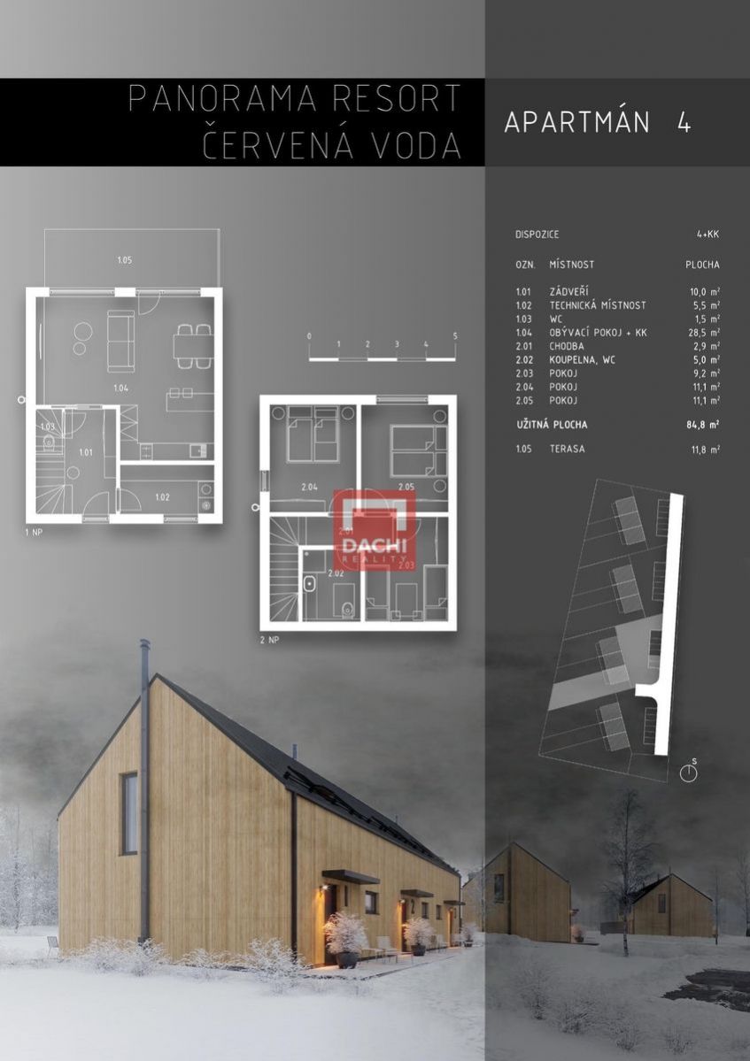 Nabízíme vám exkluzivní horské apartmány v projektu Panorama Resort Červená Voda, který se nachází na pomezí Orlických hor a Jeseníků. Apartmány nabízí úchvatný výhled na ski areál Buková Hora a okolní lesy. Celkem projekt zahrnuje 12 jednotek ve 4 trojdomech s privátním příjezdem, což vám zajistí soukromí a klid.