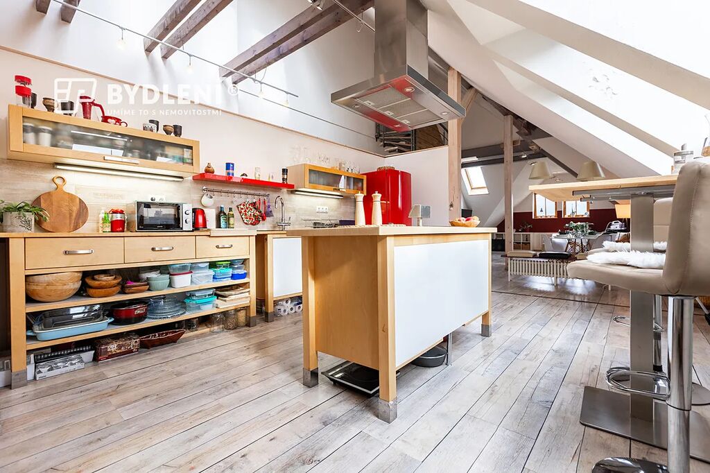 Interiér vás na první pohled zaujme otevřeným prostorem, vysokými stropy a dřevěnými prvky, které dodávají bytu jedinečný charakter. Dominantou obývací části je stylový krb, který vytváří příjemnou atmosféru a pocit domova i v chladnějších dnech.