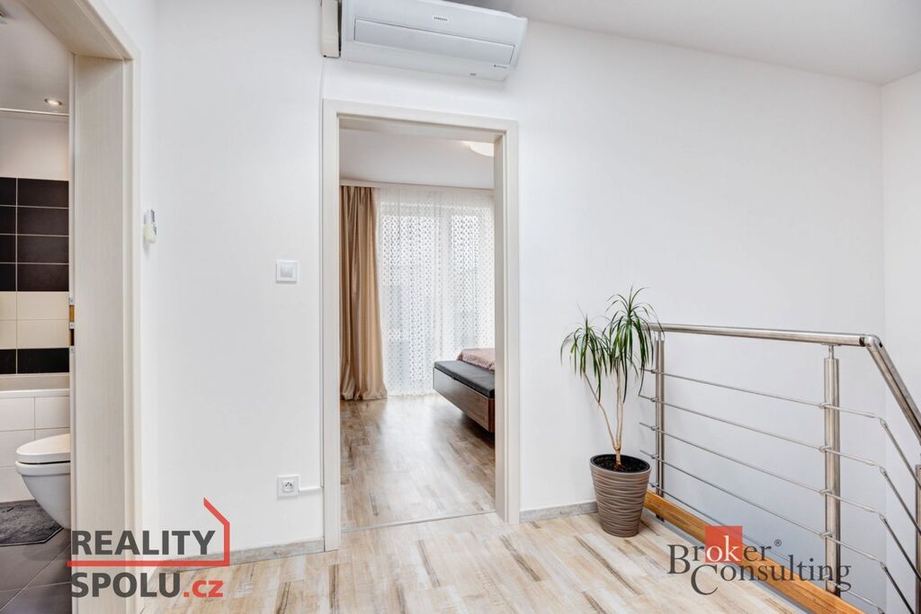 V prvním patře najdete tři ložnice, z nichž hlavní disponuje vestavěnou šatnou. Koupelna je vybavena vanou i sprchovým koutem, což zajišťuje maximální komfort. Celý dům je navržen s důrazem na moderní a funkční bydlení.