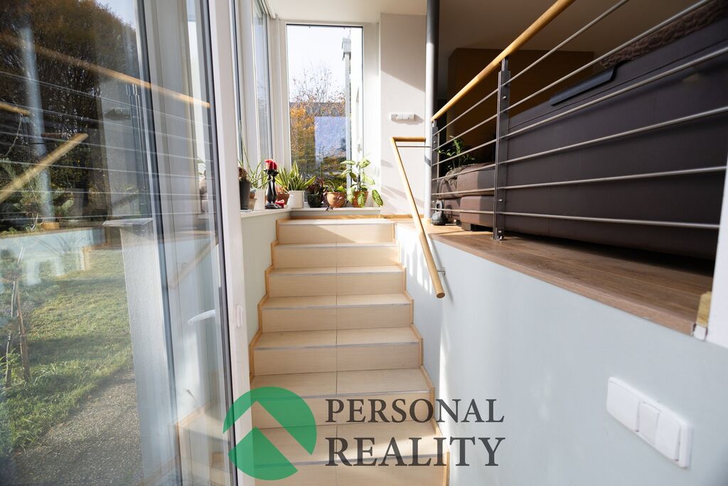 Horní patro: prosklená chodba, koupelna (WC, umyvadlo, vana a sprchový kout), dvě velké ložnice se šatnou, další samostatná místnost se vstupem na balkón a vstup na půdní prostor. Z oken horního patra je krásný výhled do okolí.