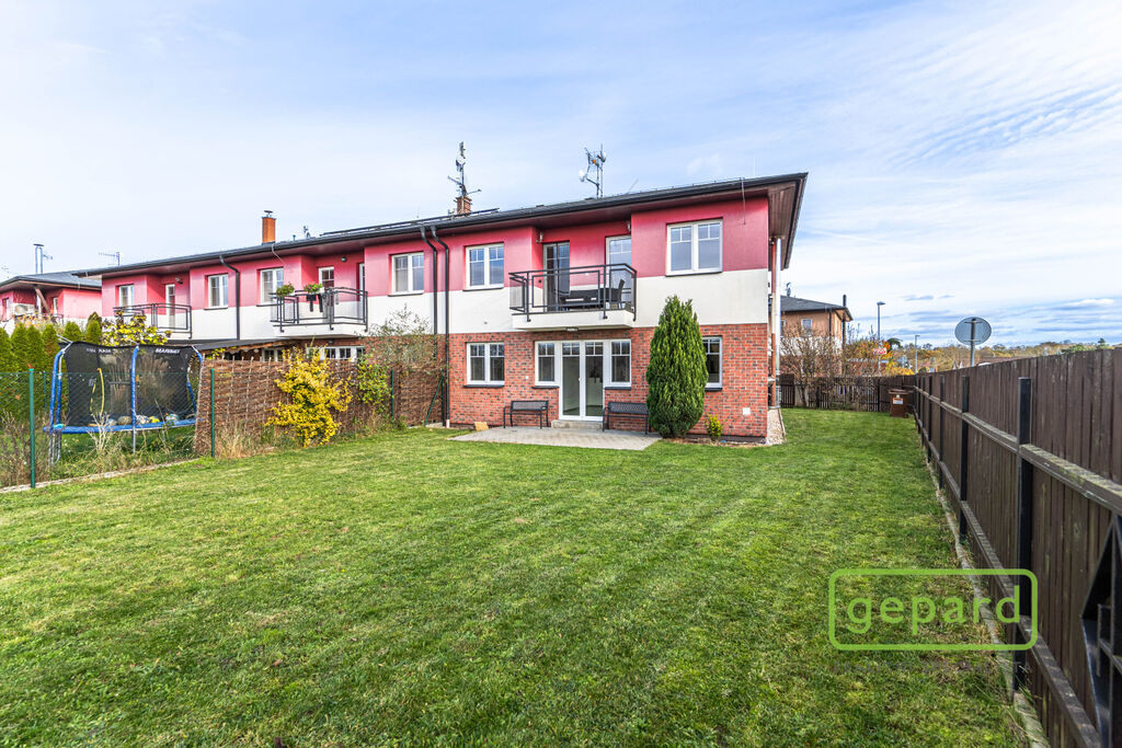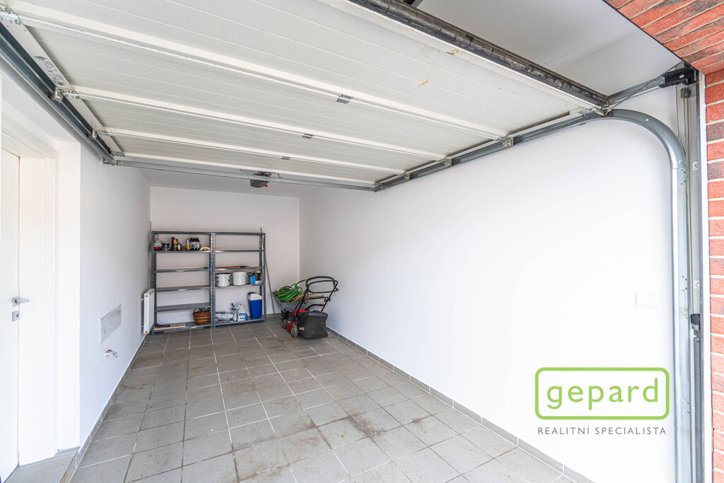 V přízemí je předsíň (6,61 m2), spíž (2,61 m2), koupelna se sprchovým koutem a WC (4,38 m2) a prostorný obývací pokoj s krbem a s přilehlou pracovnou (36,85 m2) + kuchyňský kout (6,44 m2). Kuchyně je vybavená kuchyňskou linkou včetně spotřebičů (velká americká lednice, horkovzdušná trouba, indukční varná deska, myčka, digestoř). Z obývacího pokoje je přímý vstup na terasu a do zahrady. V prvním patře je chodba (4,95 m2), koupelna s vanou a WC (8,06 m2) a 3 ložnice (11,23, 12,68 a 30,46 m2) Dvě z ložnic mají přístup na balkon. Dům je pronajímán bez dalšího vybavení. Vytápění a ohřev vody zajišťuje plynový kondenzační kotel, pro navození příjemné atmosféry nebo snížení nákladů na topení lze využít krb.