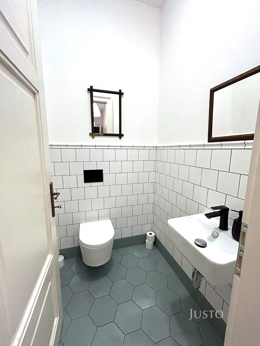 Charakter bydlení podtrhují velkorysé repliky původních prvorepublikových dveří, dřevěná podlaha, dobová koupelna se separátním WC i nová kuchyňská linka s vestavnými spotřebiči.