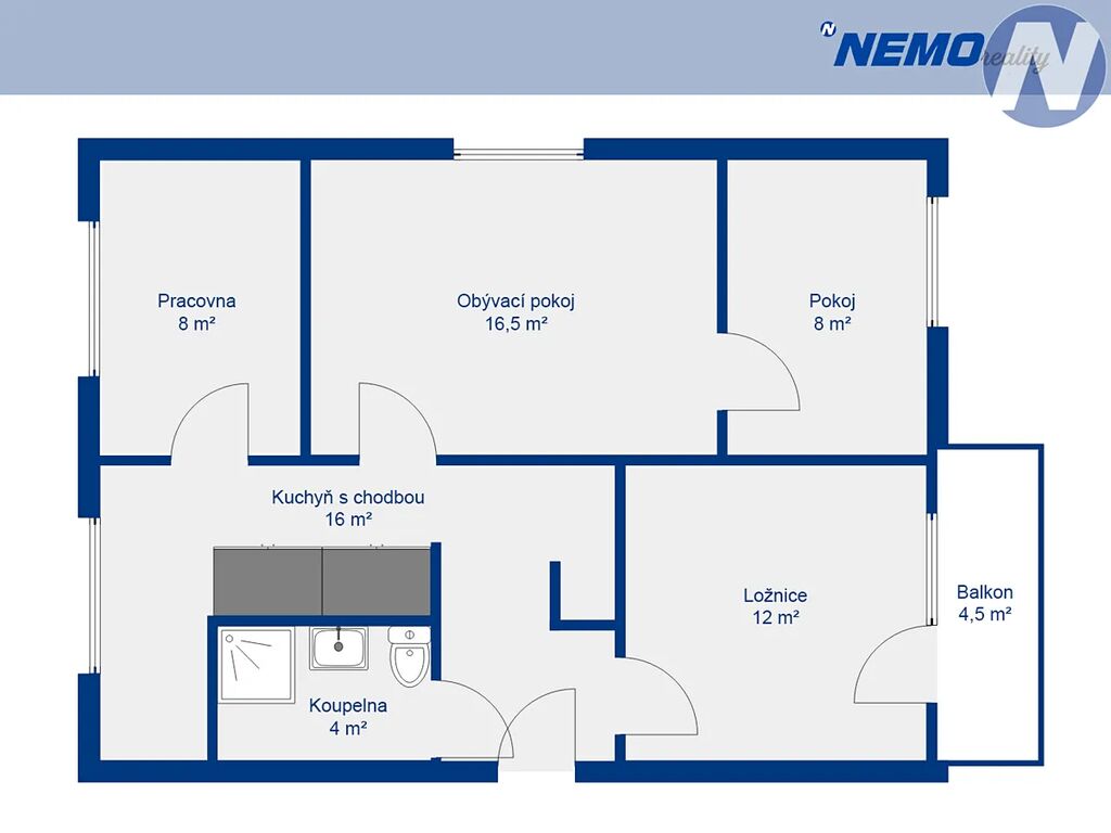 Dispozice je řešena prakticky. Z prostorného obývacího pokoje se vstupuje na balkon, na kuchyň navazuje menší pokoj vhodný jako dětský pokoj nebo pracovna a další dva samostatné pokoje zajišťují dostatek prostoru pro rodinu či pohodlné bydlení v menším počtu osob. Koupelna je zděná, vybavená sprchovým koutem, umyvadlem a toaletou.