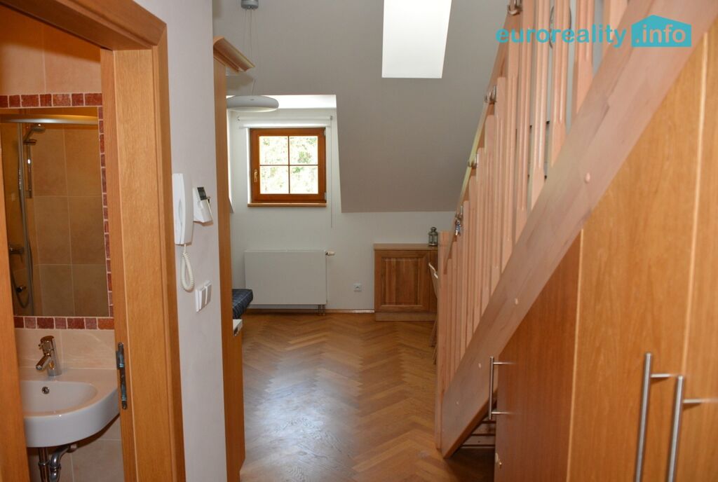 Apartmán je mezonetový, podkrovní, situovaný v posledních dvou patrech apartmánového domu Javor.