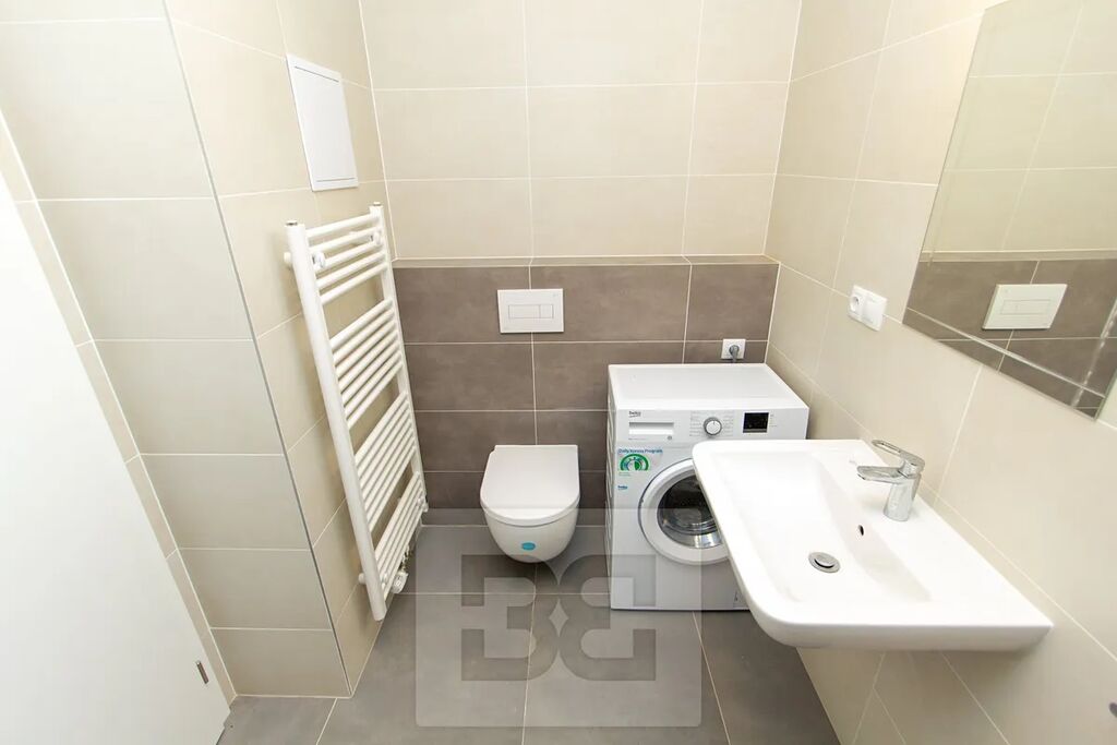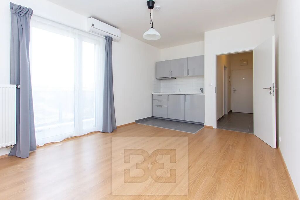 Dovolujeme si Vám exkluzivně nabídnout k dlouhodobému pronájmu krásný částečně zařízený byt 1+KK o velikosti 25,1 m2, nacházející se ve 3.NP menšího bytového domu v Tuchoměřicích, ulice V Kněžívce. Dům byl dokončen na začátku roku 2020. Vstupní dveře bytu vedou do předsíně (3,7 m2), ze které je vstup do obývacího pokoje s kuchyňským koutem (16,7 m2). Z předsíně také vstoupíme do koupelny (4,75 m2). Obývací pokoj je vybaven moderní kuchyňskou linkou se všemi novými spotřebiči (lednice s mrazákem, el. varná deska, digestoř). Obývací pokoj disponuje balkonem plochou 2,5 m2. Koupelna je zařízena vanou, umyvadlem, zrcadlem, topným žebříkem a WC, k dispozici je i pračka. Všechna okna v bytě plastová, další výhodou bytu je klimatizační jednotka.