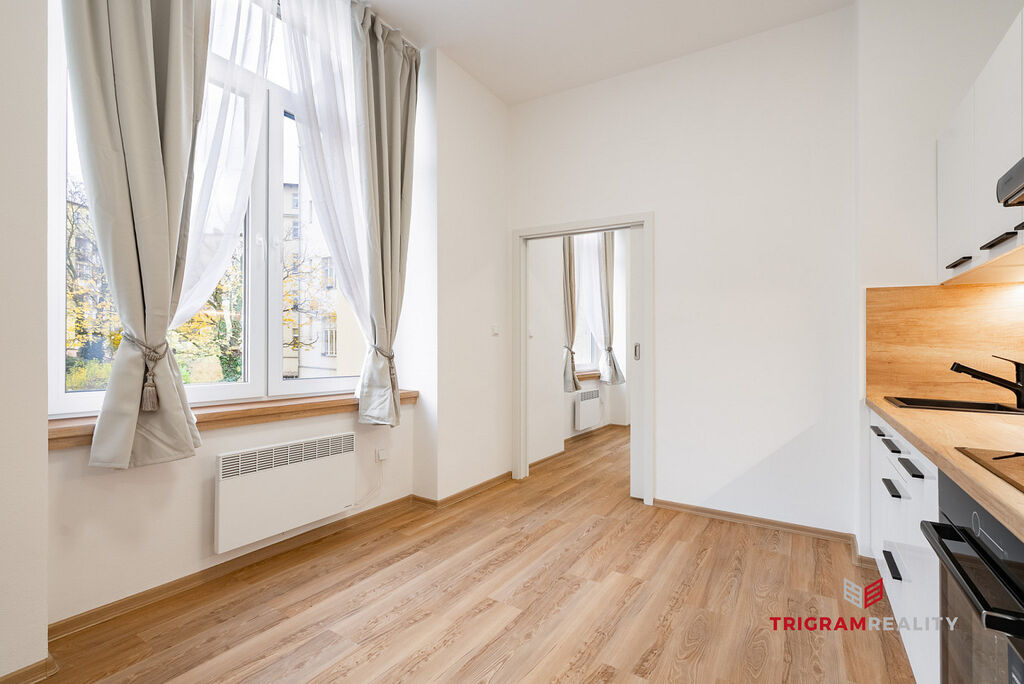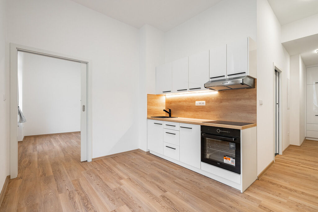 Kuchyňská linka je moderní, vybavena horkovzdušnou troubou, indukční varnou deskou, digestoří a dřezem. Dveře do koupelny i kuchyně jsou posuvné do pouzdra, což šetří prostor.