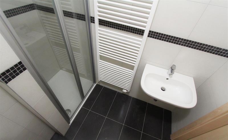Koupelně je zařízena umyvadlem, sprchovým koutem, toaletou a pračkou.