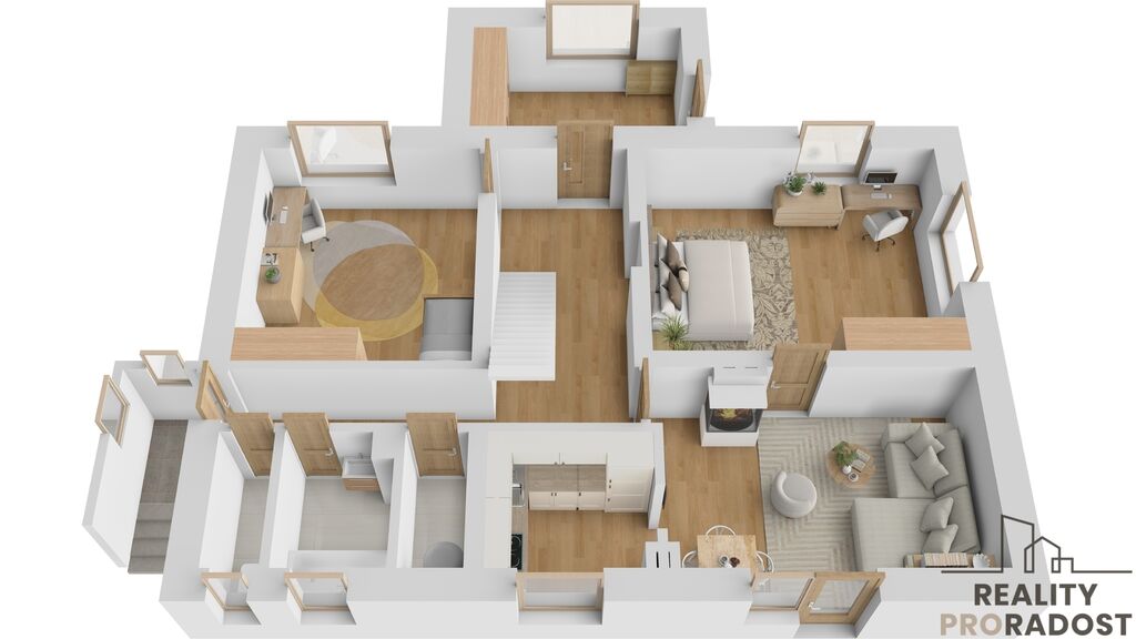 V přízemí jsou 3 pokoje , kuchyň, technická místnost, koupelna, samostatné WC a vstupní místnost. Do ložnice se vstupuje přes obývací pokoj, ale je možný vstup i z předsíně který je nyní zazděný .