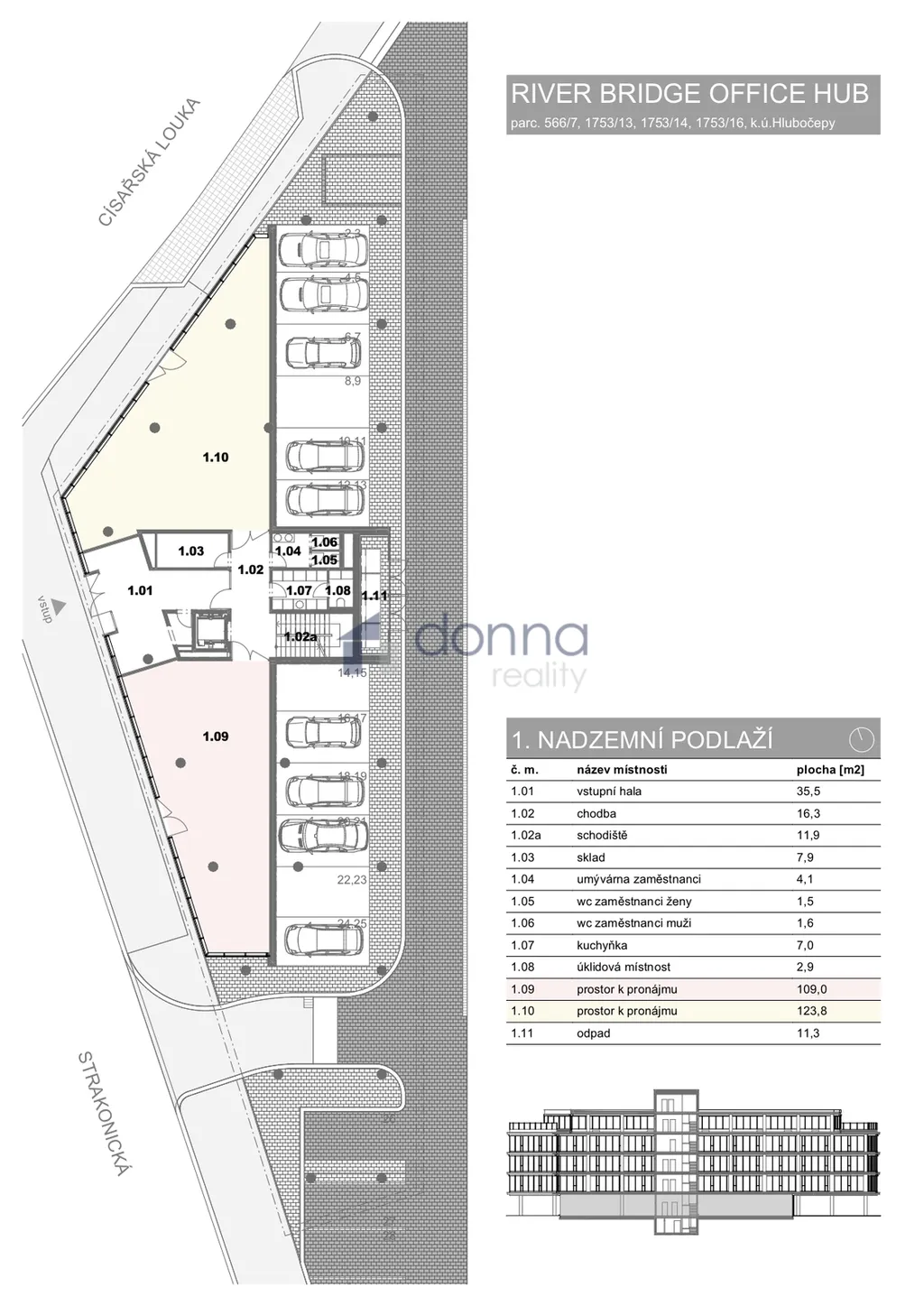 Nabízíme k pronájmu komerční prostory o výměře 99 m2, v moderním administrativním komplexu River Bridge Office Hub, Praha 5 – Hlubočepy v ulici Strakonická. Prostory se nacházejí v 1.NP se samostatným vchodem přímo z ulice. Na patře je společná kuchyňka, sprchy a toalety. Budova River Bridge Office Hub je nově projekt administrativní budovy, která se v roce 2026 stane hlavní dominantou areálu River Business Centre. Tento unikátní projekt nabízí moderní a inspirativní pracovní prostředí na břehu řeky Vltavy v bezprostřední blízkosti Dvoreckého mostu. Výhled na řeku Vltavu, Vyšehrad, ale i blízkost všech potřebných služeb, stejně tak i výborná dostupnost MHD, předurčuje budovu River Bridge Office Hub k naplnění požadavků i těch nejnáročnějších nájemců.