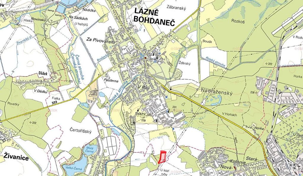 K prodeji je vlastnictví půdy na pozemcích parc. č. 1253/2, 1254/2 a 1257/44 zapsané na LV 435 v KÚ Lázně Bohdaneč. Jedná se o ucelený zemědělský soubor - orná půda a lesa s vodník tokem.