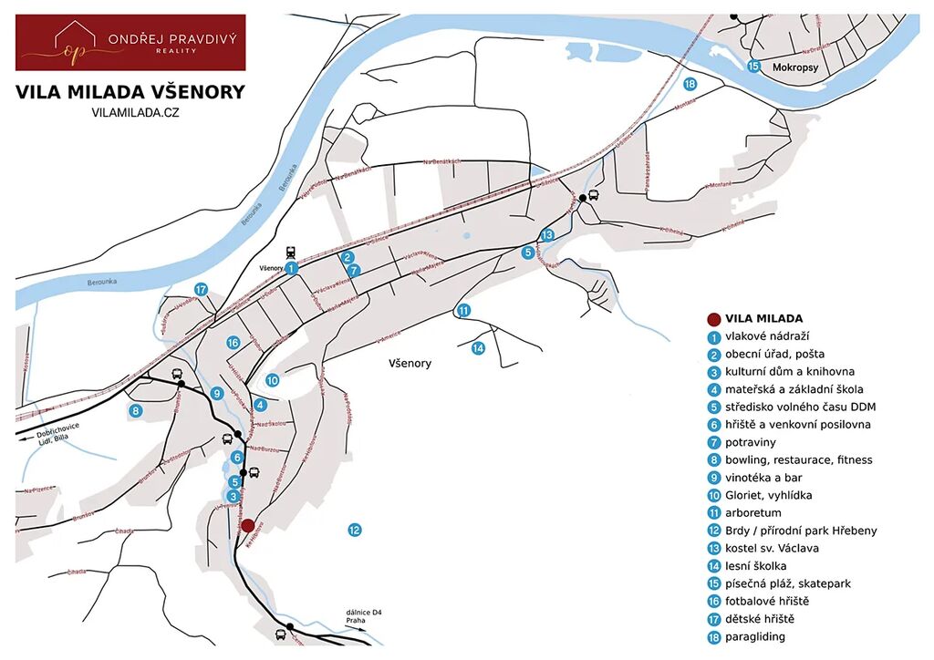 V docházkové vzdálenosti najdete mateřskou a základní školu, lesní školku či dětské hřiště. Ve Všenorech je např. pošta, obchod, restaurace, kulturní dům či knihovna. Kompletní občanskou vybavenost, obchody a služby jsou v okolí — kavárny, supermarkety, lékaři, herny, zimní stadion, bazén, a mnoho dalšího…