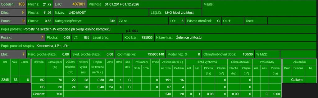 - p.č. 643 vedená jako lesní pozemek o celkové výměře 1 160 m2 (stáří lesa 109 let- zastoupení dřevin smrk, bříza, modřín)