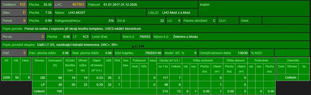 - p.č. 661 vedená jako lesní pozemek o celkové výměře 799 m2 (stáří lesa 71 let- zastoupení dřevin bříza, dub)
