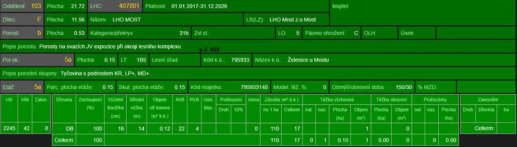 - p.č. 502 vedená jako lesní pozemek o celkové výměře 1 508 m2 (stáří lesa 50 let - zastoupení dřevin dub)