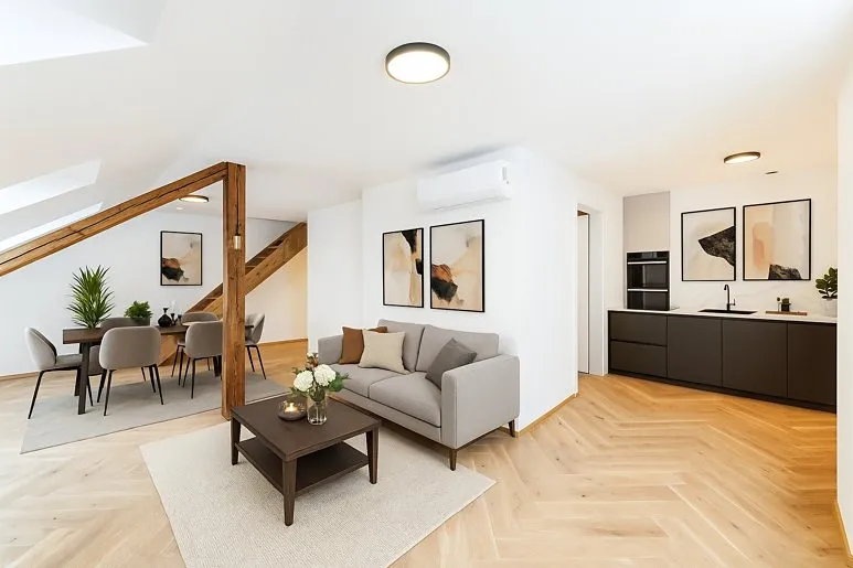 Vstupní úroveň bytu tvoří prostorná hala s technickou místností, obývací pokoj s kuchyňským koutem, koupelna se sprchovým koutem. V horní části se nachází průchozí pokoj vhodný jako pracovna či šatna a dvě oddělené ložnice z čehož jedna disponuje vlastní koupelnou s vanou.