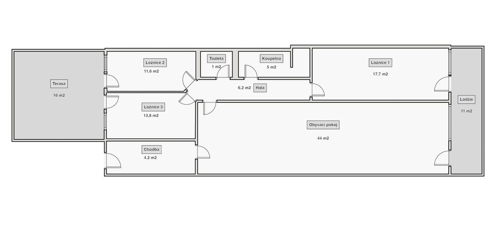 - Dva venkovní prostory – lodžii (11m²) a terasu (16m²),