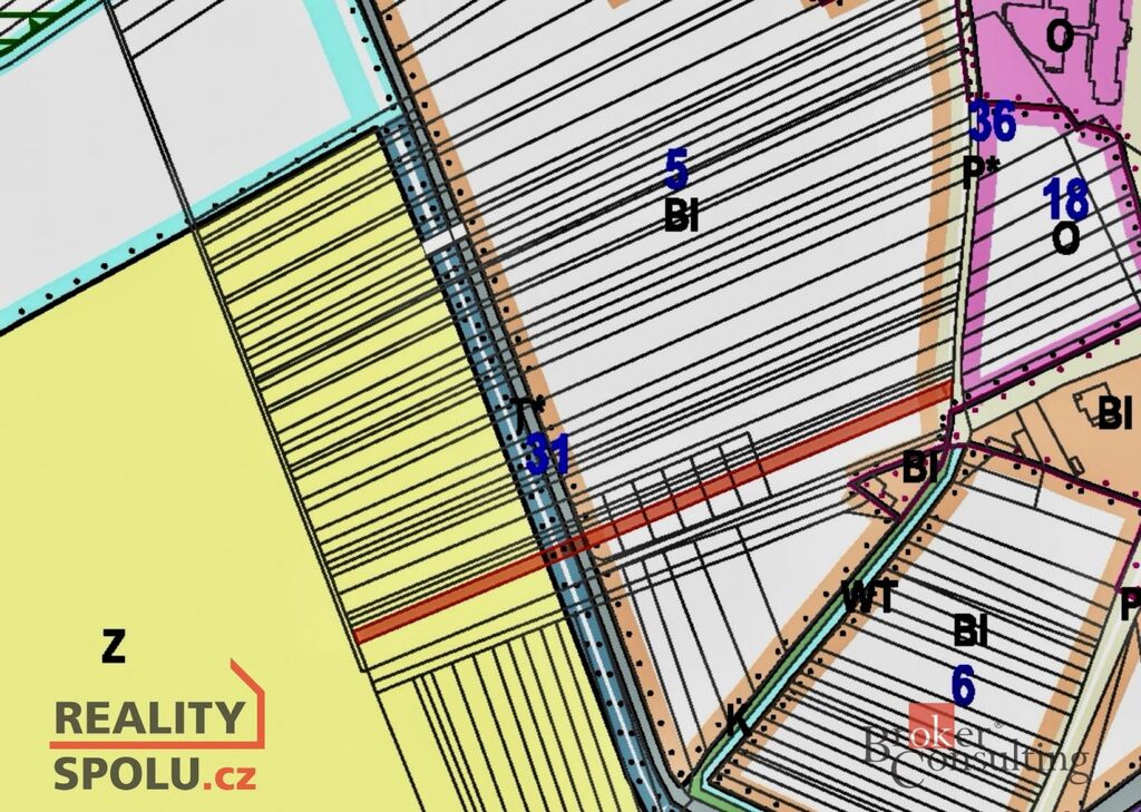 Mezi zemědělskou plochou a plochou k bydlení je pozemek s výměrou 30 m², který slouží k technické infrastruktuře.