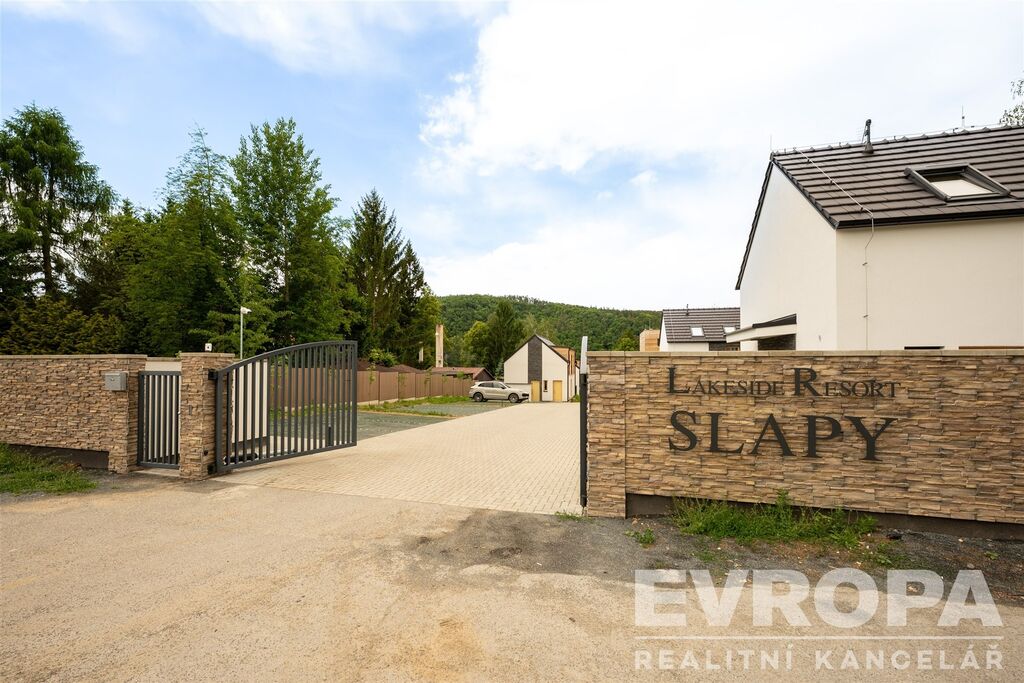 Nabízíme k prodeji dům (112,8 m2) s pozemkem (373 m2) v luxusním Lakeside Resortu Slapy. Tento exklusivní resort na Nové Živohošti je uzavřená privátní zóna s vyhřívaným bazénem a dostatkem parkovacích stání včetně dobíjení elektromobilů. Od tohoto domu je to pouhých padesát metrů k vyhřívanému bazénu a dalších 50 metrů je to přímo přímo na pláž Slapské přehrady. Dům se v prvním patře skládá z předsíně, samostatného WC, šatny, technické místnosti a prostorného obývacího pokoje s kuchyňským koutem. V druhém patře jsou tři ložnice a koupelna s wc.